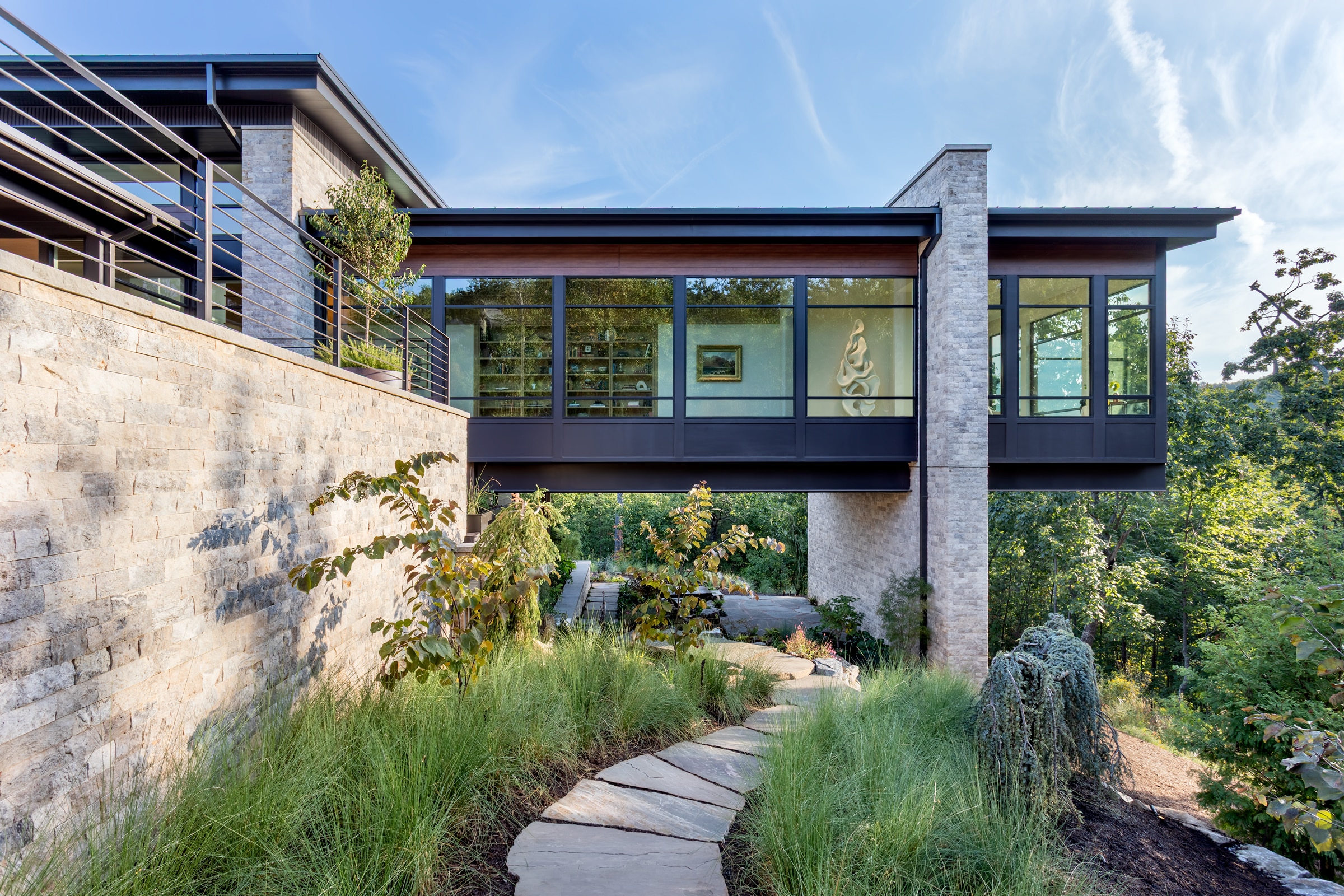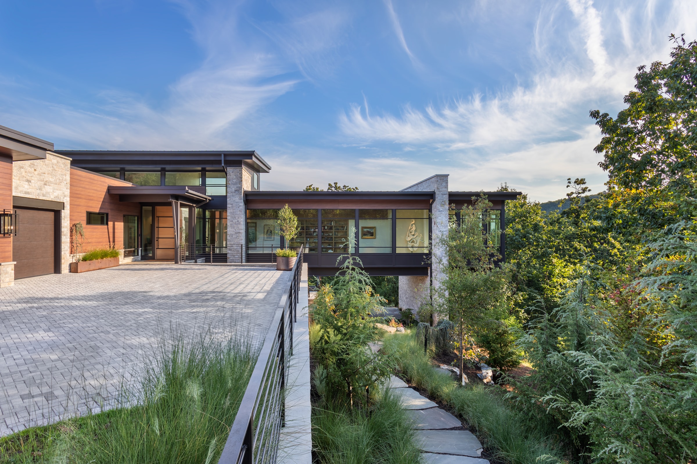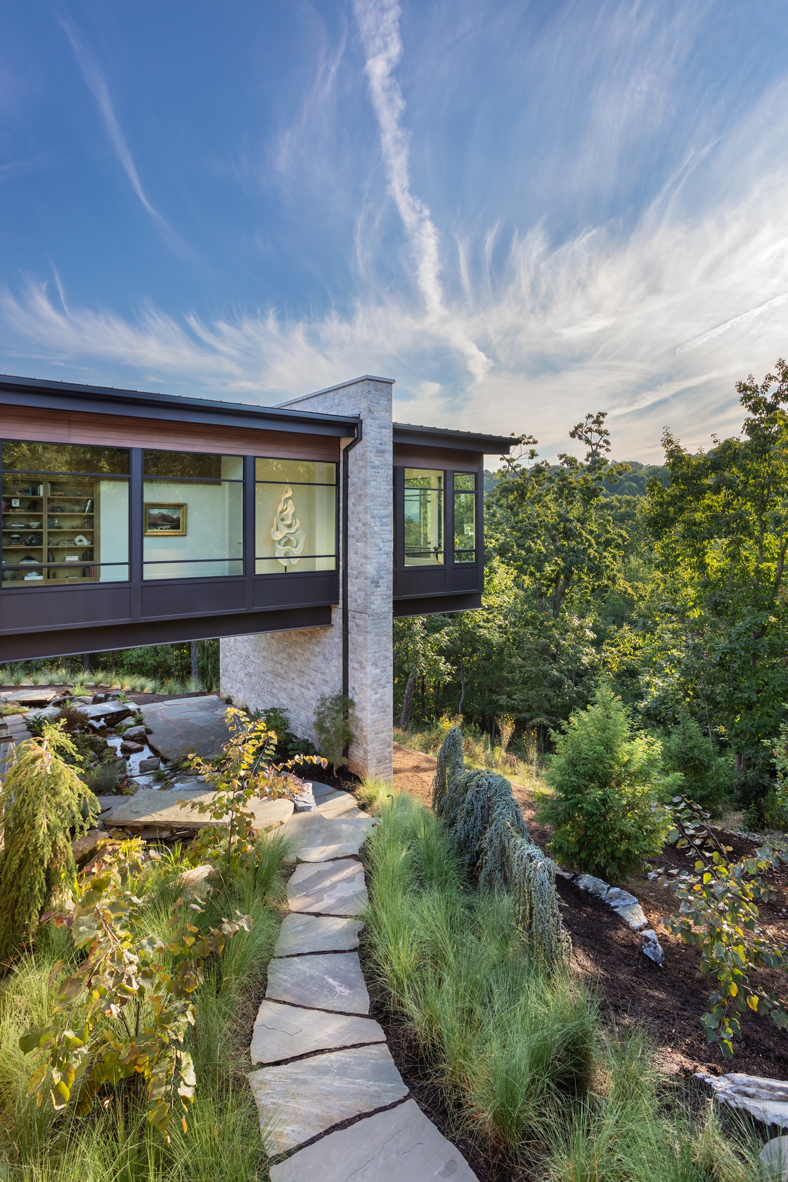 Tucked into the north slope of Paris Mountain in Greenville, this multiple award-winning residence is a thoughtfully crafted mountain modern retreat built as both sanctuary and gallery. This winner of the International Property Awards 2025 for residential property development in South Carolina and the NAHB 2025 Silver Award for Best One-of-a-Kind Custom Home is designed for a retired art gallery owner and a financial executive. The home blends clean lines, curated materials, and wide-open views of Caesars Head. Bluestone Construction was brought in early to assist with site selection, team assembly, and construction. The final design—anchored by a long, light-filled corridor for displaying art—was inspired by a fleeting scene in a foreign film. Expansive windows frame the Blue Ridge Mountains, while warm wood finishes, custom millwork, and minimalist detailing offer a quiet backdrop for the couple’s collection of paintings, sculpture, and rare books. Every detail, from slope-sensitive siting to the interplay of light and volume, was crafted to reflect the clients’ refined, creative lifestyle and to blur the line between dwelling and gallery.